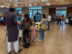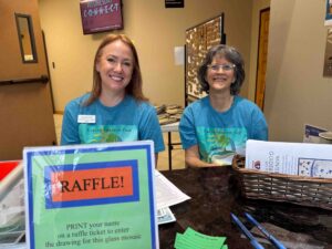 8:00 – Thunder clapped, the rain approached, and inside volunteers set up tables and attached banners identifying each of the 32 participating organizations scheduled to arrive at 10:00. The Welcome table got organized at the front doors – registration and flyer info, treasure hunt map and gift bags, raffle tickets, raffle prizes, and carry bags – waiting for the public. The fair entrance and Upper Room were ready, and the Fellowship Hall was lit up with festive string lights and lanterns. Wow! It was beautiful! Now if the participants would just decide to come despite the rain…