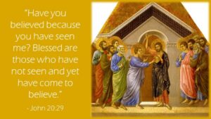 In this week’s gospel the risen Christ appears to the disciples and offers them the gift of peace. Thomas is criticized for doubting, but he asks for nothing more than the same experience of the risen Christ the rest of the disciples had. By the grace of God, Jesus returns a second time and offers his body as living proof to Thomas. Thomas’ story is our story, and Jesus comes to us, seeking us out and giving us the gift of faith. Jesus loves Thomas back into a relationship. Even amid doubts and questions, we experience the resurrection in our Sunday gathering around word and meal and in our everyday lives.