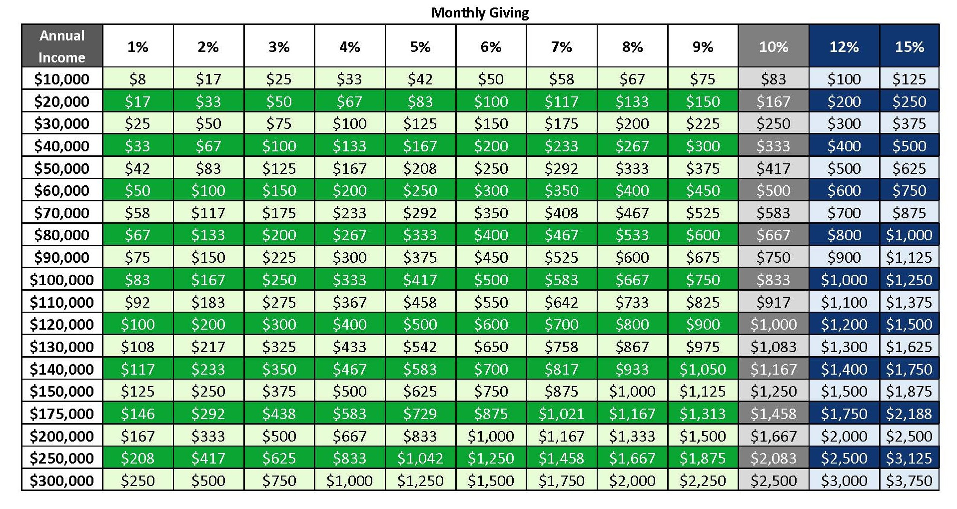 Below is a table calculating suggested percentage of monthly giving options based on Annual Income.